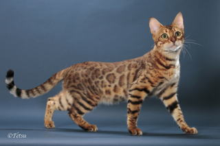 | 薫子さんはコルトと流牙のお嬢様です。蓮花姐さんの孫になります!!蓮花の体系を見事に引き継いでいるので 長さがあります。落ち着いたカラーに散らばる無数のロゼットが魅力的です。誰の子でもよく面倒を見て素晴らしいお母さんになりました。スレンダーで背も高いのでモデルさんみたい!長い足でリズミカルにステップを踏む姿はとても美しくさすがBengalと惚れ惚れいたします。TVにも出演しました。 |